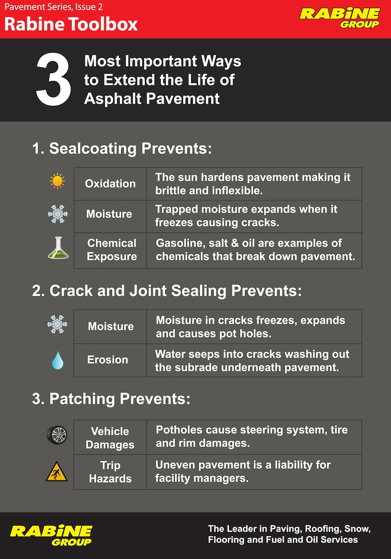 Maintenance is key to extending the life of any pavement. External forces such as weather and traffic can take there toll on your pavement—but there are steps you can take to avoid any further deterioration and extend your pavement’s life.