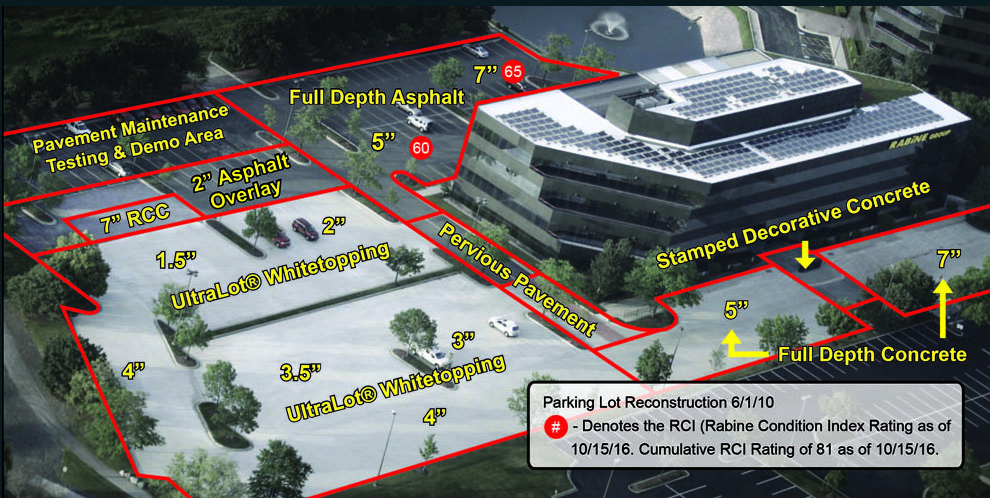 When we moved to our headquarters in 2010, the parking lot needed work. Before starting construction, our engineering team decided to build our parking lot that can showcase of our services and can be used as a research center to test asphalt and concrete products and mix designs. Thus, the Rabine Pavement Design Center was created. Today we show clients and visitors how different pavements age, what pavements last the longest and what kinds of pavement are best for certain areas. We test out new innovative pavements and perfect the construction processes then watch how they compare to other pavements.